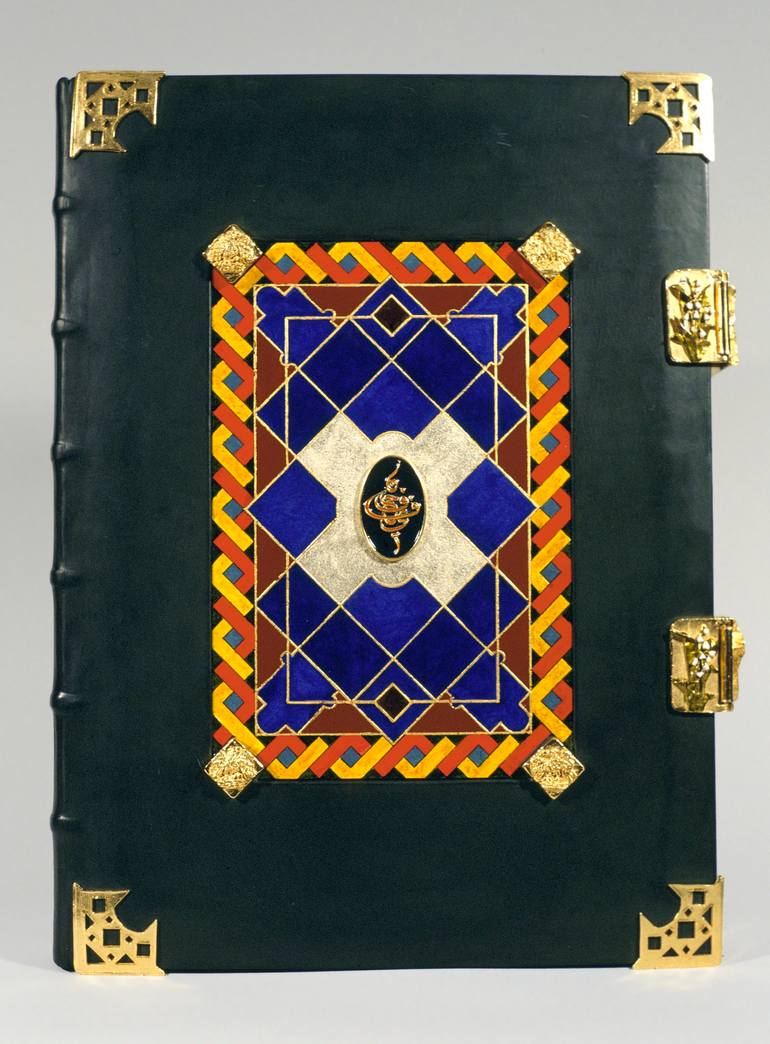 Blank book of various vintage handmade papers and sheepskin parchment.Green Hewit calf with inlaid panels of lacquered acrylic and gold leaf on Rives BFK. Lost wax cast Vermeil hardware includes central medallion filled with couleurs vitrail, bosses and clasps with heraldic emblems, and strapwork co...