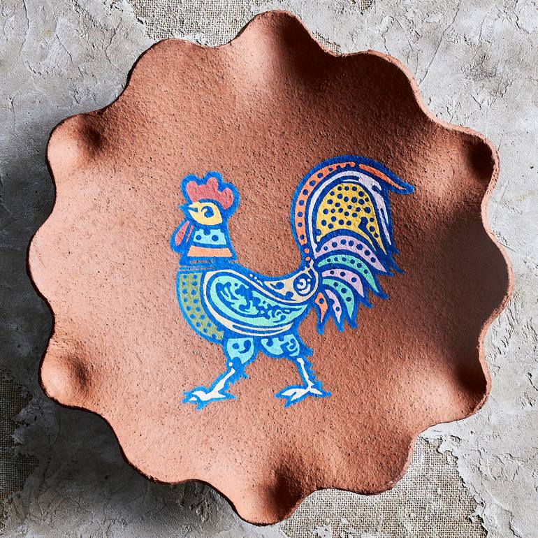 Colorful rooster on red stone ceramic bowl Sculpture