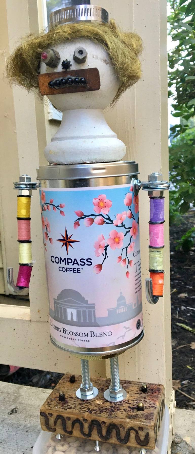 I made her from an coffee can from my favorite coffee house. This can has cherry blossoms on the can
