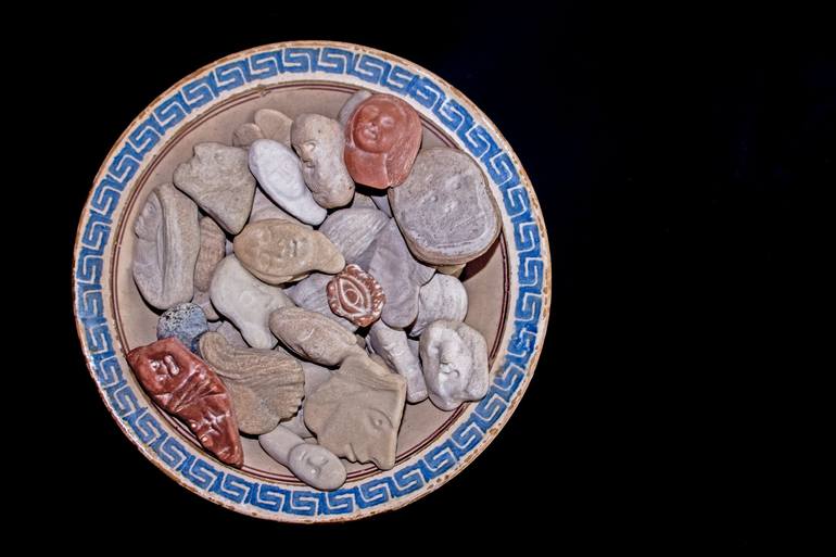 A composition consisting of figures carved in stone, placed in an old ceramic bowl found, decorated with a Greek meander in blue.