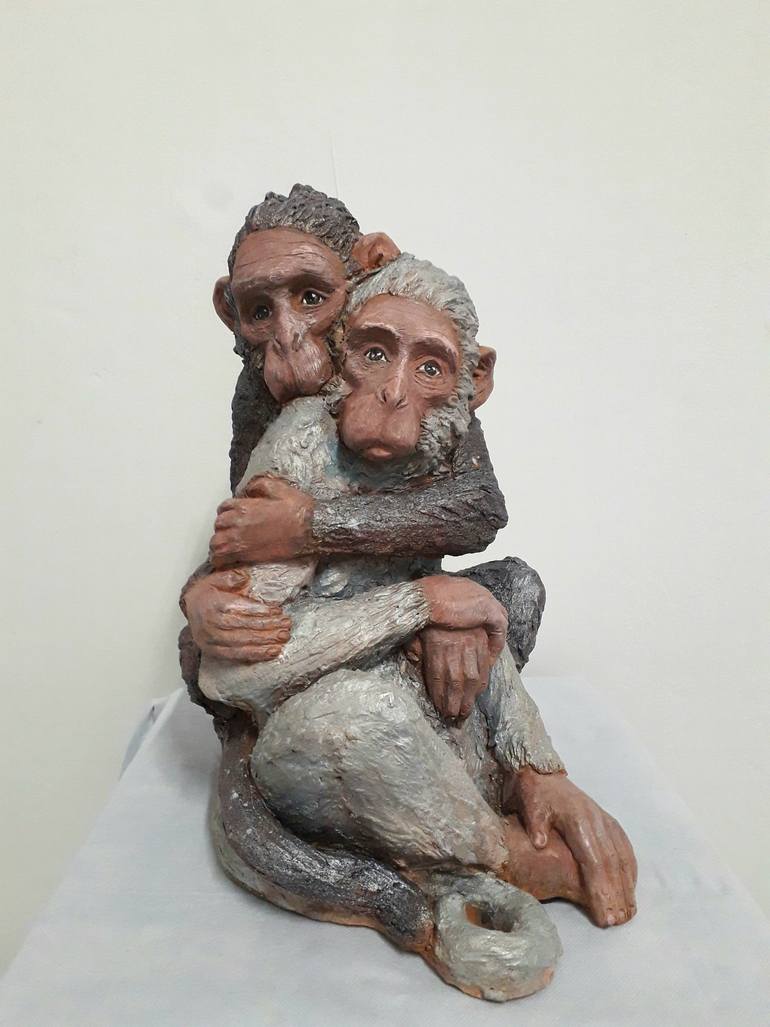 in this sculpture we find two monkeys clasping each other in an embrace, the feeling of comfort and protection of the two souls huddled together looking at a point on the horizon. On the back we find the hand of Fatima, a symbol of protection. in all of Marinaro's works, the monkey represents our in...