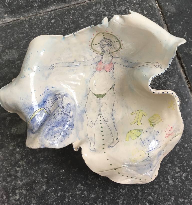 This vessel depicts the ideal virgin mother surrounded by the reality of her situation; a drunk man passed out with a bottle of vodka - my daughters alcoholic dad; baby clothes being sorted for the birth - domestic chore distraction from alcoholic partner.