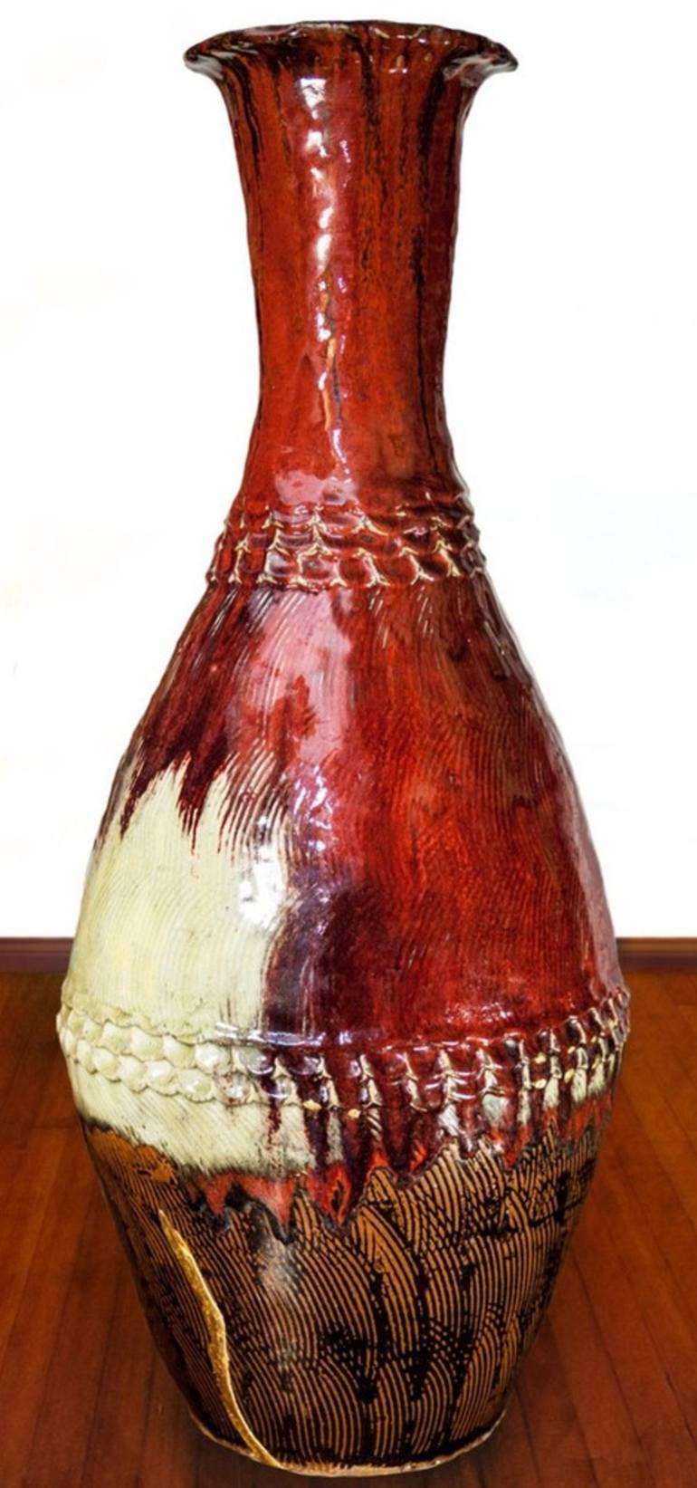 Made in 2012. Coil Jar, natural gas firing, Copper Red and Tenmoku glazes, multiple glazes and firings. Multiple layers of 24 karat gold crack repair. There is something magical about this jar.