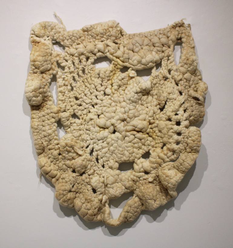 Crochet, Felting, wool, rust. After being diagnosed with cancer, I began to investigate ideas of the body as an archeological site. This piece's shape is modeled off of images of tumors.