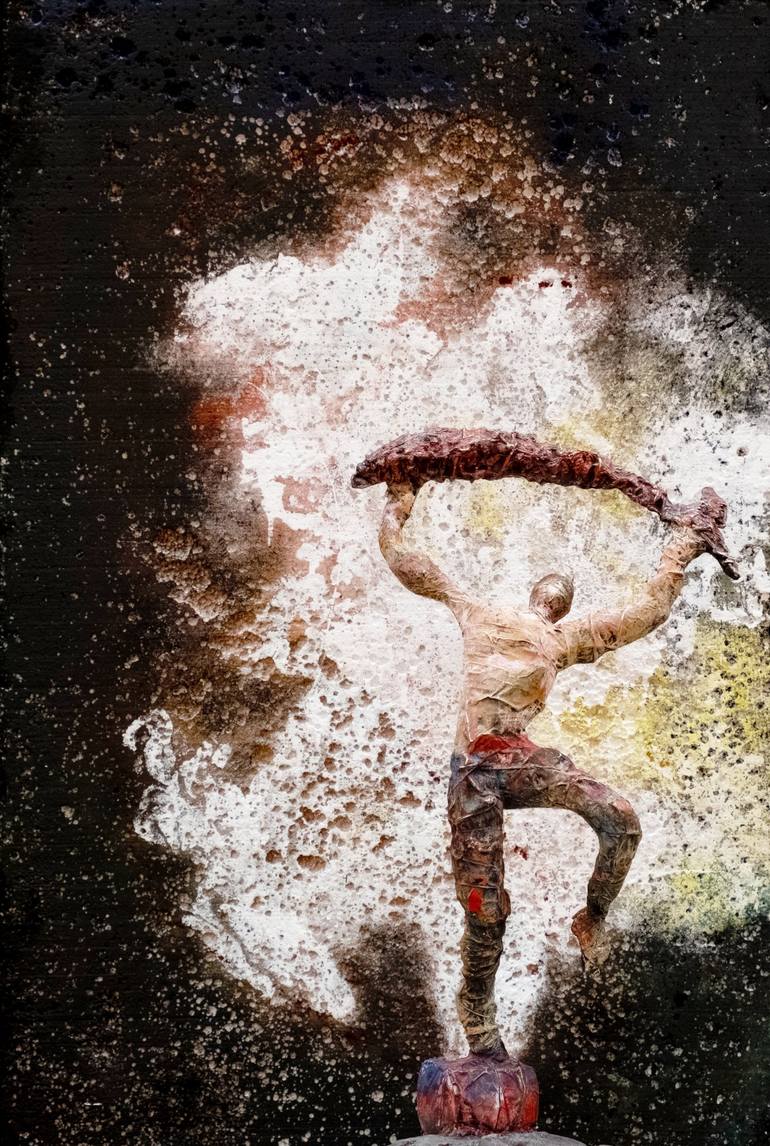 "Cosmic Balance" – Sculptural Harmony A striking bronze figure balances on a pedestal, gracefully lifting a fish-like form above, embodying movement and equilibrium. The dynamic sculpture by Helder de Carvalho is set against an explosive cosmic background, painted by Angélica Carvalho, where white ...