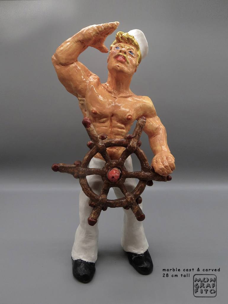 A homage to Genet/Fassbinder's Querelle and to the gay culture history of cruising. Marble cast and sculpted. A note for those who are not familiar with the process of casting. One of the modern materials used in sculpting is the marble powder. Grinded marble, often from Carrara (for its whitenes...