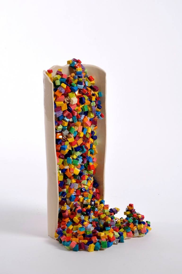 Hundreds of hand glazed ceramic cubes cascade out of the curvaceous form.