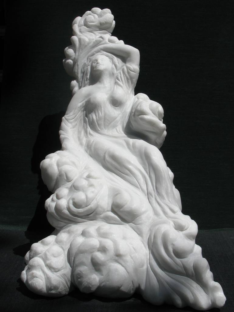 This piece was carved from a piece of pure white Yule Marble, during a snowy January. She is my impression of relaxing on a cloud and whenever we bring her out it always seems to snow.