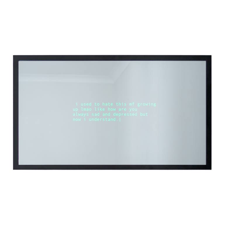 This mirror shows real-time tweets about depression. Every 10 seconds this mirror finds a tweet that has been posted less than a second ago and typewrites it onto this mirror. The tweet is anonymous and worldwide, giving you the chance to look at yourself in the reflection of someone's emotions in ...