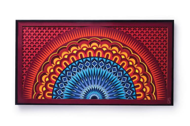 A paper sculpture based on mandala geometry and kaleidoscopic colors. This intricate paper art is made up of 22 layers of delicately cut 300 gsm paper. Titled 'Dusk' for its breathtaking colors and illustration of the sun. You will lose yourself as you stare out into the horizon. Find tranquility in...