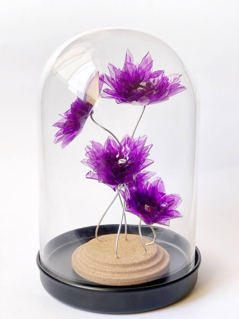 This unique sculptural artwork was created with great amount of love, passion and dedication. Found and collected single use plastics had been individually hand-cut, painted and assembled to form red lotus flowers symbolizing love, beauty and dignity. The textural elements have been stained using se...