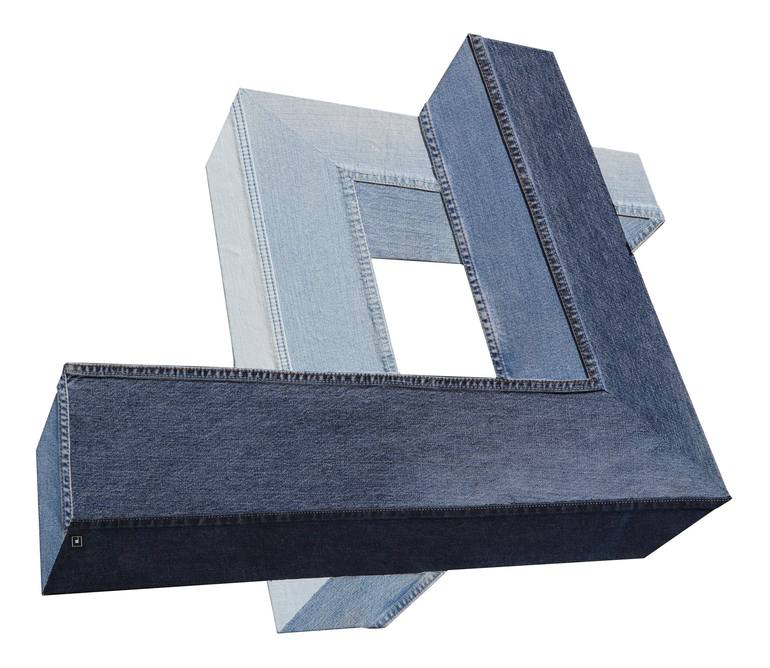 This wall panel is covered with used blue denim jeans. Following a design in perspective, this artwork looks 3-dimensional but is flat. Different colors of denim have been used to give a sense of light and shadow to amplify the optical illusion of depth. Antonius Driessens made this work near the ci...