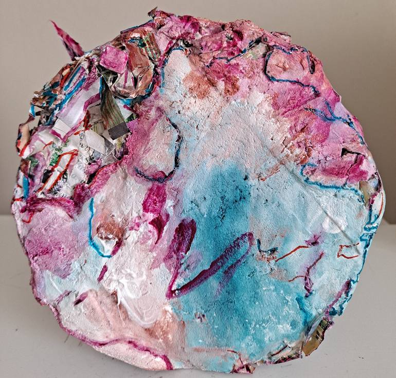 Destroying data paper documents i found the material very interesting. I decided to use it somehow. Let it for days in the water. Then press it into a round bamboo mold. Then let the paper disk to dry in my garden. Then partialy recovered with coating and acrylic. Stands by itself. Two sides painted...