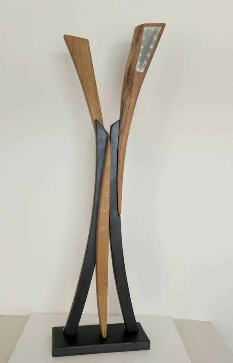 Large artistic sculpture in solid oak wood, metal sheet and metal effect paint; oil finish. It is an object that creates a unique atmosphere in the environment in which it is located and, if illuminated, creates suggestive shadows. In its forms the work follows the original structure of the wooden p...