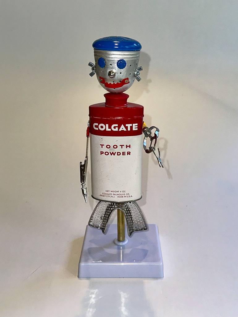 Dr. Phil McCavity! 12" X 4" X 7" Vintage 1940’s Colgate Tooth Powder tin, dental impression tray, loose leaf tea infuser, Dental Matrix Bands Retainer, wingnuts, acorn nut, sawtooth hanger, furniture nails, charms. This piece can hang directly on a wall via the attached D-ring or can stand using the...