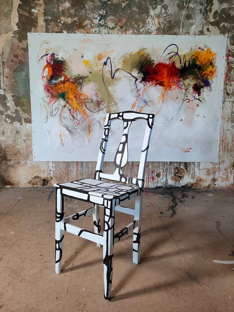 This artwork has been inspired by Dubuffet's works especially the "Jardins d'hiver" I visited at Centre Pompidou Paris France. This chair is a very old one, nearly 200 years, found in a farm in France. This has been restored and painted at the studio, respecting the traces of use and cyrons.