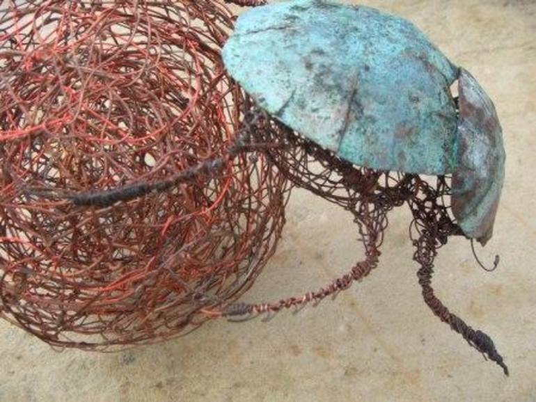 Unique hand woven and soldered copper and nitrate sculpture of scarab beetle and ball. Created mainly from reclaimed copper wire and sheet copper, with nitrate applied through heat. A perfect gift for indoors - mantelpiece, shelf or table display, or outdoors, if secured. An opportunity to own an...