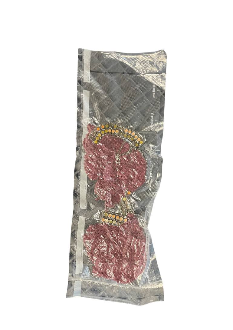 Description “ERK02” encapsulates the interplay of elegance, nostalgia, and resilience within a meticulously vacuum-sealed composition. The artwork features vibrant, textured elements adorned with intricate, jewel-like embellishments, including crown motifs that evoke regality and authority. By seal...