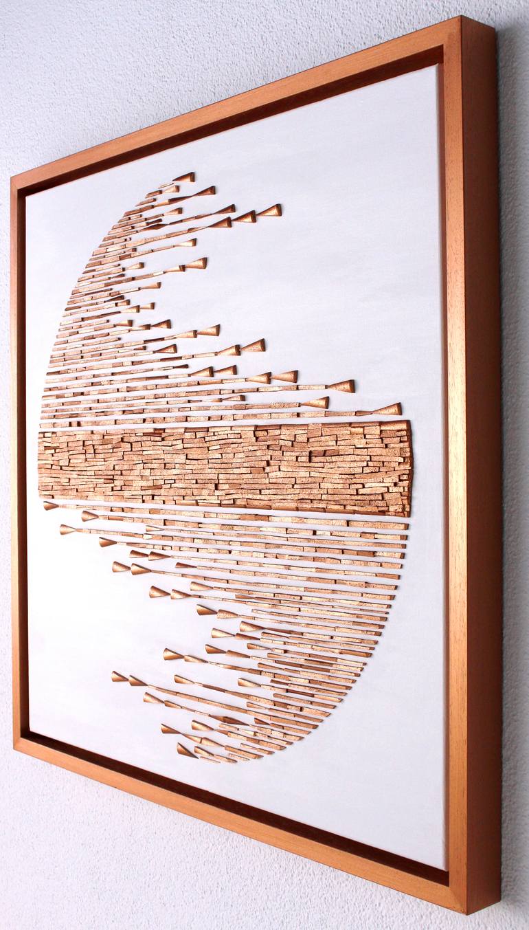 My work is inspired by the rich, warm tones of copper. Each piece is meticulously handcrafted: I carefully cut and arrange the bark on the canvas, ensuring every detail is thoughtfully placed. The varying perspectives and the three-dimensionality of the copper elements create a harmonious balance, ...