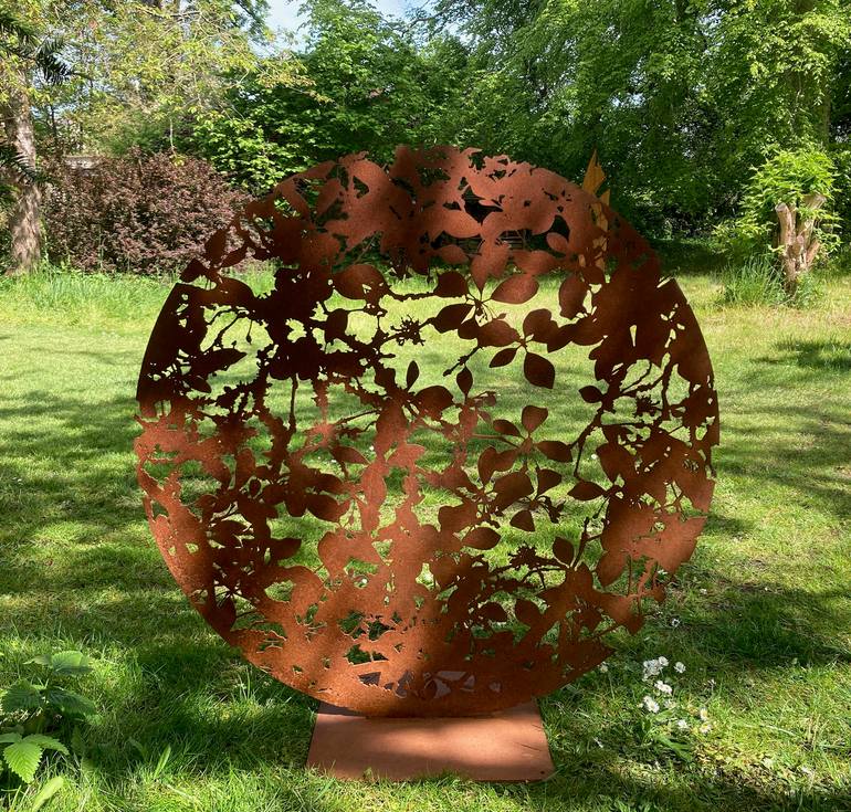 Inspired by the tree canopy, a 100cm Corten weathering steel freestanding garden sculpture with a 40cm base plate. The base plate has drilled holes for mounting onto a plinth or pinned into the ground