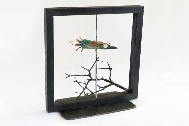 This work is inspired by the flight of a bird and is a movable piece. The bird rotates on its axis. I used a wooden frame as a container and glued it to a slate base. I incorporated a small branch from a tree in my garden to incorporate it as an organic element and as a reference point to frame the ...