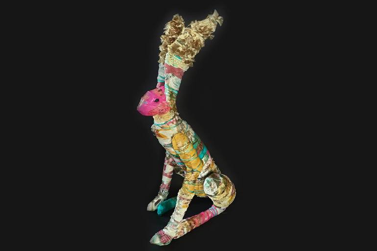 I use several collage and paint techniques on the sculpture before it is dipped in a medium to harden the fabric and seal it. Usually when I insert the glass eyes, the characters are “born” and this is where I name them.