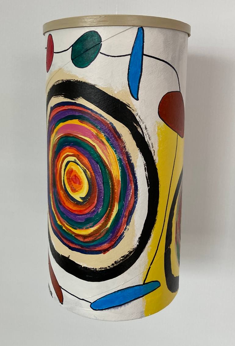 Hanging sculpture ( hanging hardware included). Lee Bul and Phyllida Barlow inspired me to pursue hanging sculptues. Viewer should feel a party atmosphere with the energy sockets against bright colors. Painted tubular cardboard structure and painted plastic lid. The sculpture moves with the si...