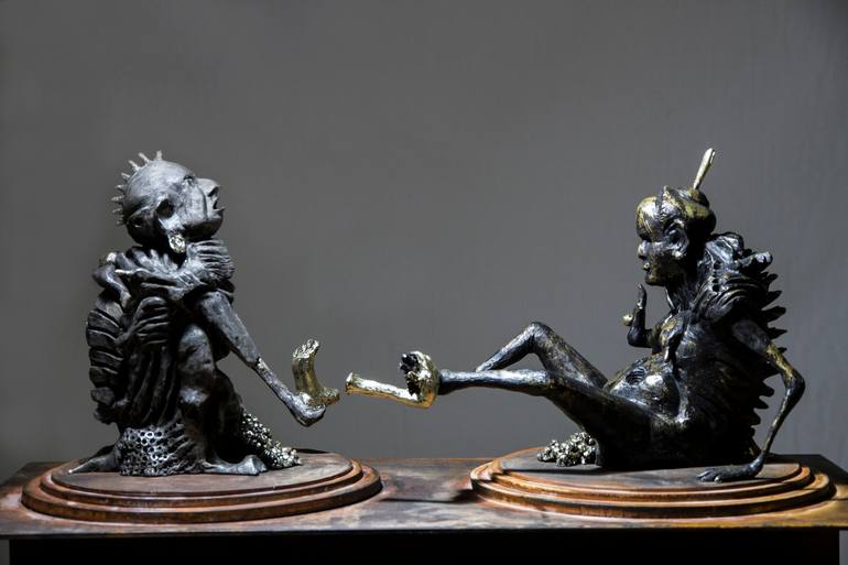 Dos seres zoomorfos se miran y desovan frante a frente. Un sueño extraño.