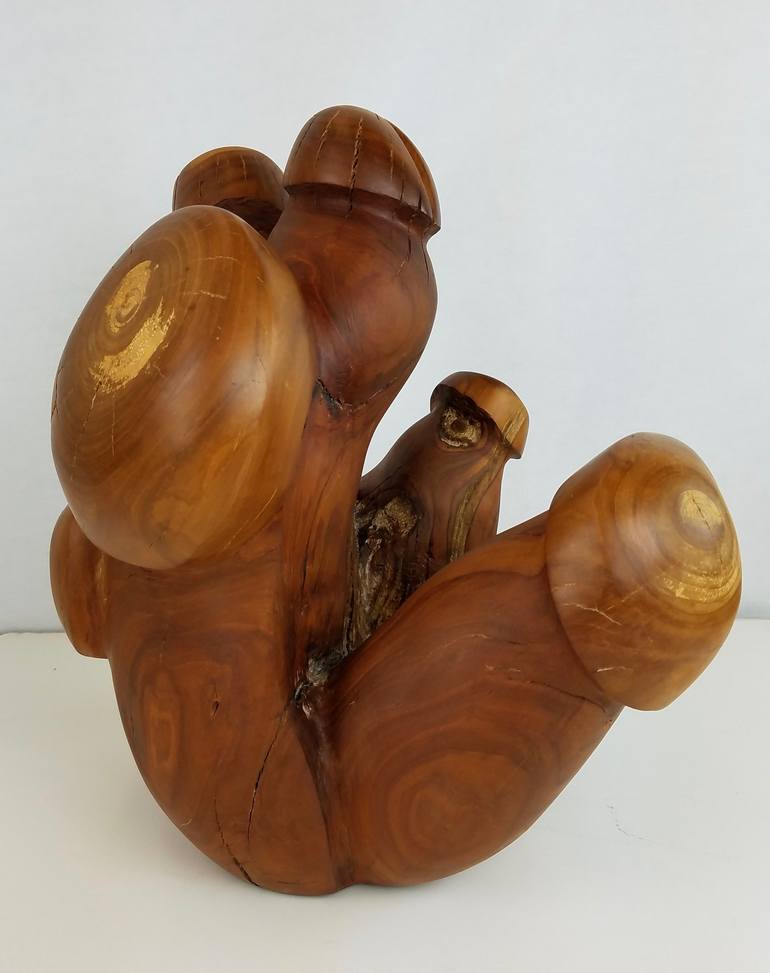 This sculpture implies abundance, an cornucopia of rhythmic forms. It was craved from the trunk of an old apple tree. All of the forms grow from one block of wood. Varied color and pattern flow within each form. It's organic in structure with a conceptual style.