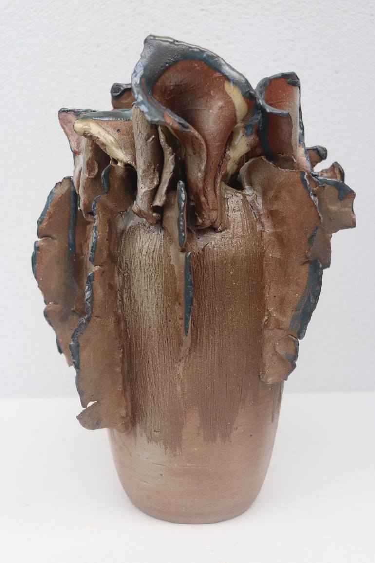 "Ethereal Bloom 006" is a poetic ceramic vessel that radiates quiet elegance and natural complexity. Glazed in a warm, transparent brown, the surface allows the subtle textures of the clay to shine through, grounding the piece in earthy richness. Rising from the vessel are intricate, hand-built flow...