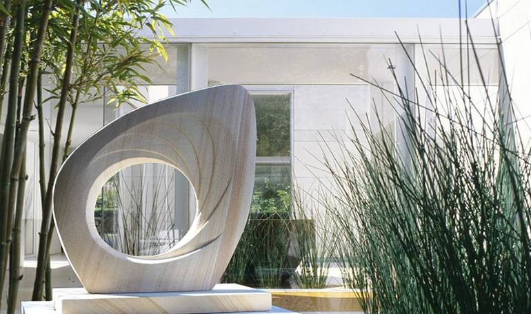 Christophe’s early interest in sculpture began in Soapstone from the age of 10, and was introduced to the medium of sandstone by his French born mother and sculptor, who, herself, had been fortunate enough to receive invaluable tuition from her neighbour and well-known Sydney sculptor, the late Mitzi McColl, and although completing many soapstone, clay, hebel stone and award winning sandstone works during his school years, Christophe’s talent remained dormant thereafter for many years through the life distractions of career, travel, and family. Early in 2007, Christophe took a break from his successful marketing career as a brand developer to spend more time with his family. This gave Christophe the opportunity to unearth his hammer and chisels and revisit the blocks of sandstones that had been laying dormant awaiting his return in his back garden: he has never looked back.. Christophe chooses to work from natural Australian sandstone, handpicked from Gosford and Bundanoon quarries; he has a very strong connection with the stone and mentions … “The quality of stones I hand pick from the quarries hold incredibly beautiful iron bands of grain which I attempt to unveil and celebrate in all my pieces…. Sandstone holds many aesthetically pleasing qualities that i admire. I love the raw physical nature of sandstone, it’s colour, it’s texture, touch, durability and the historic history and connection it holds with the earth ” … Sandstone enables the smooth, simplified forms, subtle curves, flowing lines and rounded surfaces found in Christophe’s abstract works, and there are also many variations and combinations of textures waiting to be touched in his pieces. These textures include naturally weathered, frosted by chisels, rasped rough and polished smooth. Christophe has clues about the attributes of any given stone before he starts to sculpt it, but its full beauty and unique grains and characteristics are often not revealed until the sculpture nears completion. Conder’s artworks encourage viewers to discover new elements with each perspective, inviting them to explore the balance between void and fullness, the inner turning outward, concave meeting convex, and light following dark. This harmonious coexistence of opposites, as he sees it, reflects the complexity and unity inherent in nature itself.