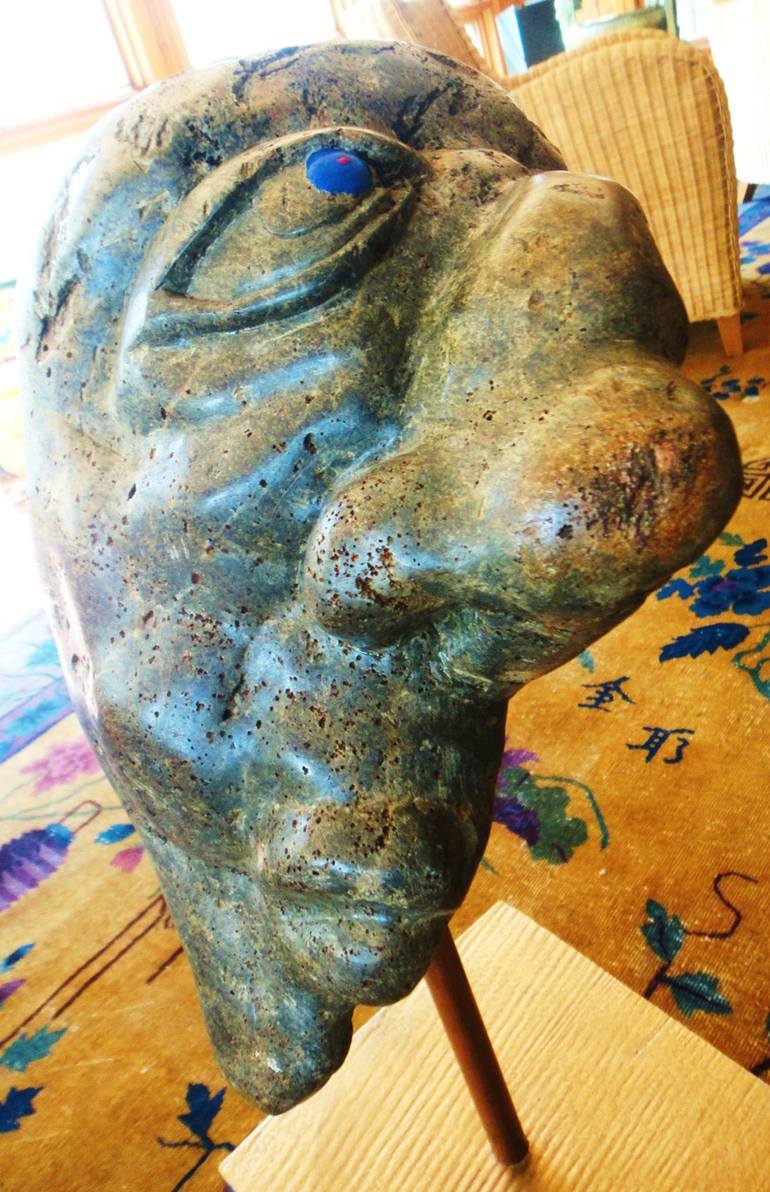 Playful depiction of strength. Made from a rock I dug from the ground in North Carolina. The head is mounted on a copper pipe and wood base.