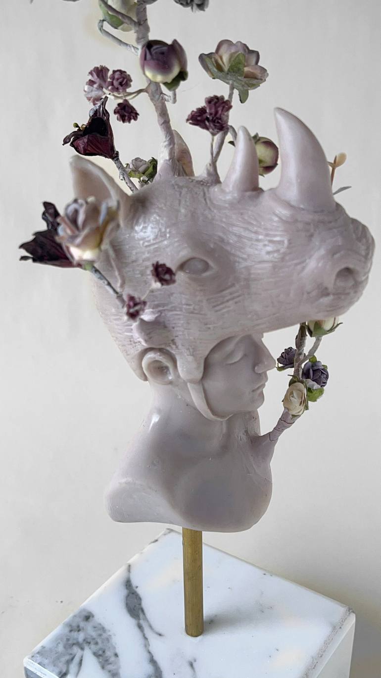 FORZA is a resin bust of a man with a rhino mask or hat. The piece refers to the metaphorical meanings of the Rhino symbol in ancient cultures: agility, solitary, wisdom, paradox, freedom, stability, gratitude, longevity, judgment, and grounding and peace of mind. For the artist, a Rhino reminds he...