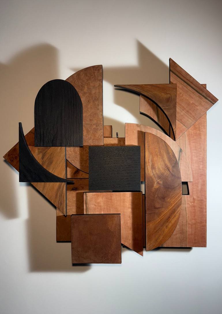 FROM THE MOON This work is inspired by the many facets of the moon as it shifts from light to dark. The selected woods not only evoke the interplay of light and shadow that sculpt the mysterious face of this satellite, but also its textures. Wall sculpture made of MDF veneered with vavona burl, wal...