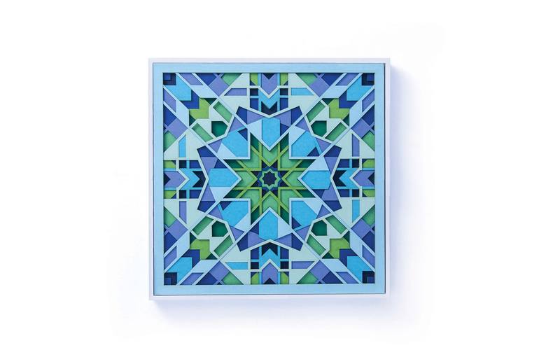 This original paper cut art is inspired by sacred geometry and frost. It is made up of 10 layers of delicately cut 300gsm paper. Titled 'Frost' for its edgy design and cool color scheme, it comes alive under the spell of light. Find tranquility in its perfect fusion of geometry and calming colors. ...
