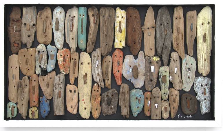 14 x 24 x 2.5 inches mixed media painting/collage on wood panel. This is an assemblage. Ready for hanging or it can sit on your mantle. Please secure properly as it weighs 8 pounds. This is a painting/collage and the surface is textured. It is constructed with driftwood, nails and glue. Clear var...