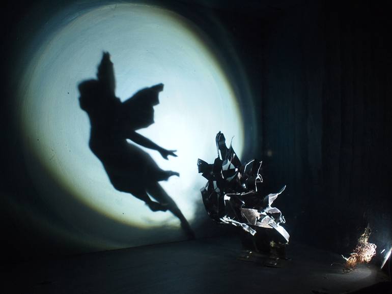Shadow sculpture. The silhouette of the fairy shown ready to fly in front of the moon is in fact the shadow of the metallic sculpture.
