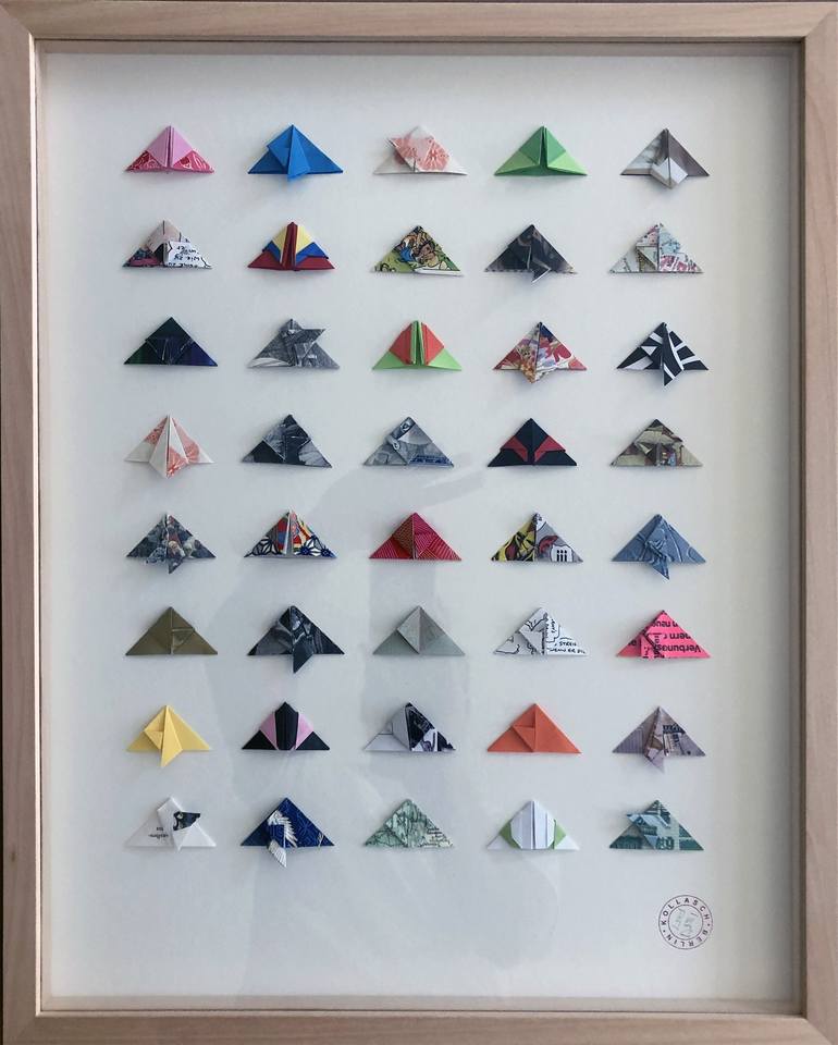 40 different handmade folds 50x40cm Framed in lime or ash wood Folding by KOLLASCH I arranges the foldings like the collection of butterflies in a display case of an entomologist. Each of the abstract, origami-like folded triangles are unique. Among the selected papers, i mainly use second hand pa...