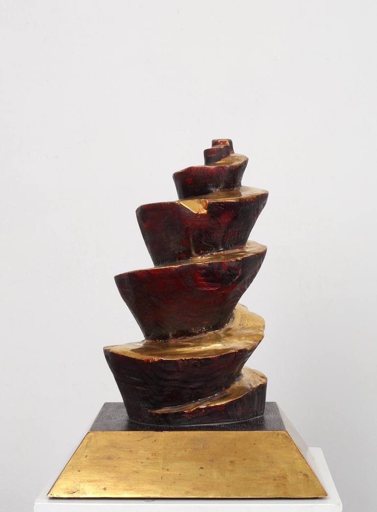 Faraway and everywhere is a sculpture made of solid wood, it is gilded with 22 carat gold leaf. The natural wood structure is hand crafted and stained in a dark violet color, then sealed with the natural product schellack. All of the sculptural work is produced with this very old and traditional tec...