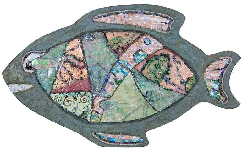 This is a whimsical mixed media piece, part of the Fascination Series. Its vitreous enamel and dichroic glass on copper mounted on wood with inlaid mosaics and stone. The outside shape is that of a fish, an ancient pagan and Christian symbol. Inside of it is an abstract image of organic shapes. This...