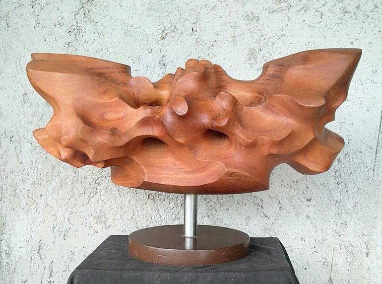 Fatamorgana is made of jack-fruit wood, a kind of tropical wood which is harder than teak or mahogany. This sculpture is supported with massive stainless-steel cylinder, welded to steel structure inside cast brown coloured resin.