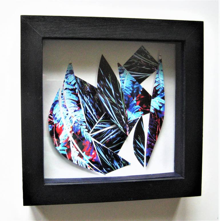 this photo montage is a relief construction made from fragments of cut photograph built up in layers away from the backing board.giving an impression of the vegetation of the forest floor. This small piece is box framed so can be free standing or wall mounted