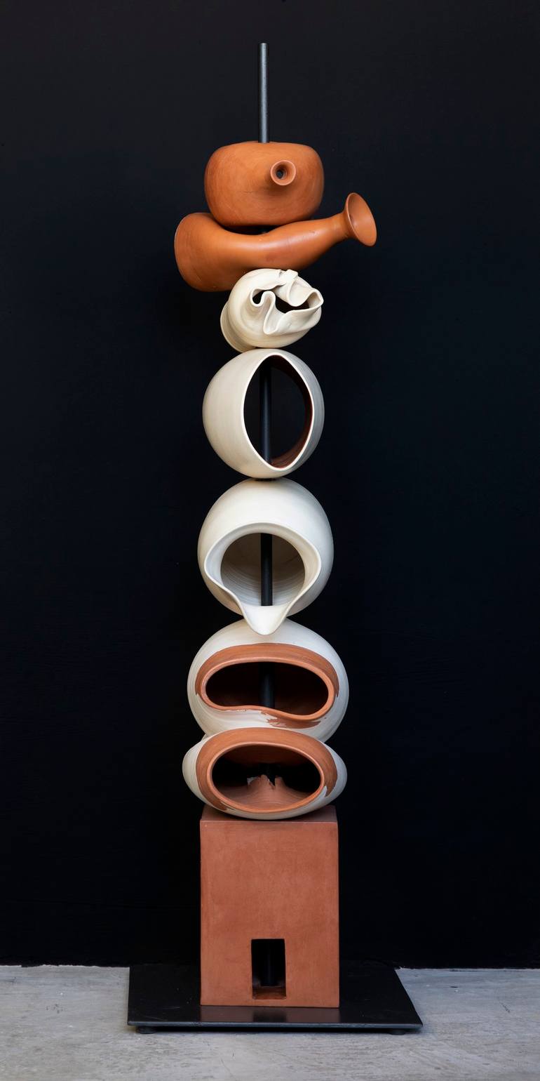I was born in Barcelona and I graduated in Fine Arts in Cuenca's University. I am currently working on the creation of Totems, made up of stacked pieces of stoneware, which come from the field of utilitarian ceramics. I use shapes with expressive deformations, fitting them into columns of variable composition. When I started working in this craft, I realised that everything revolved around the feminine. The earth, the circle and the shapes that emerge from this millenary technique produce utilitarian pieces that are the mark of ancient civilisations, apparently fragile, but which have survived thousands of years underground. The superimposition of ceramic pieces crossed by an iron rod was born as a symbol of women's work, care and generosity towards their loved ones, and at the same time alludes to the feminine role and its historical link with the domestic sphere.
