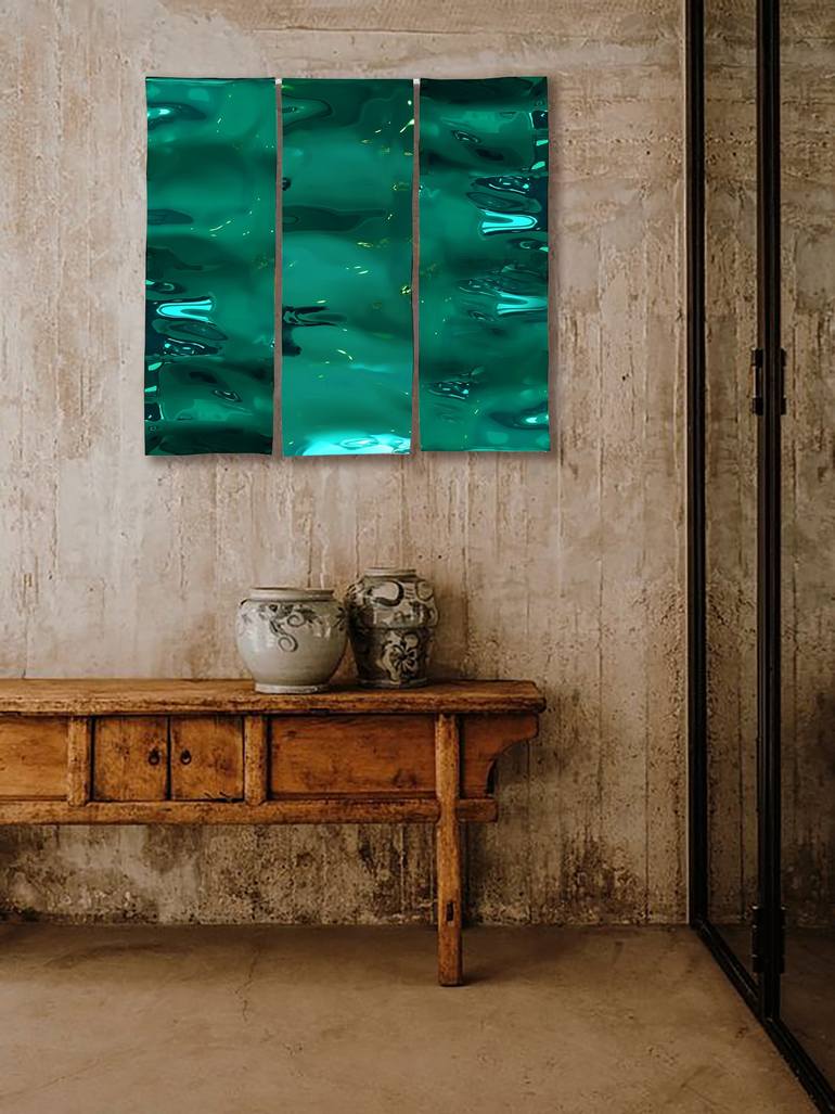 Color; All Green, hard to depict by the camera. 3 individual sculptures, each 86 cm x 30 cm x 3 cm / 33" x 12" x 1.2". Total ; 90 cm x 86 cm . Weight around 1 kg. Fed up with flat shapes and paintings? Beautiful shades of Green, giving the feeling of peace, calmness and serenity. The Artwork is ...