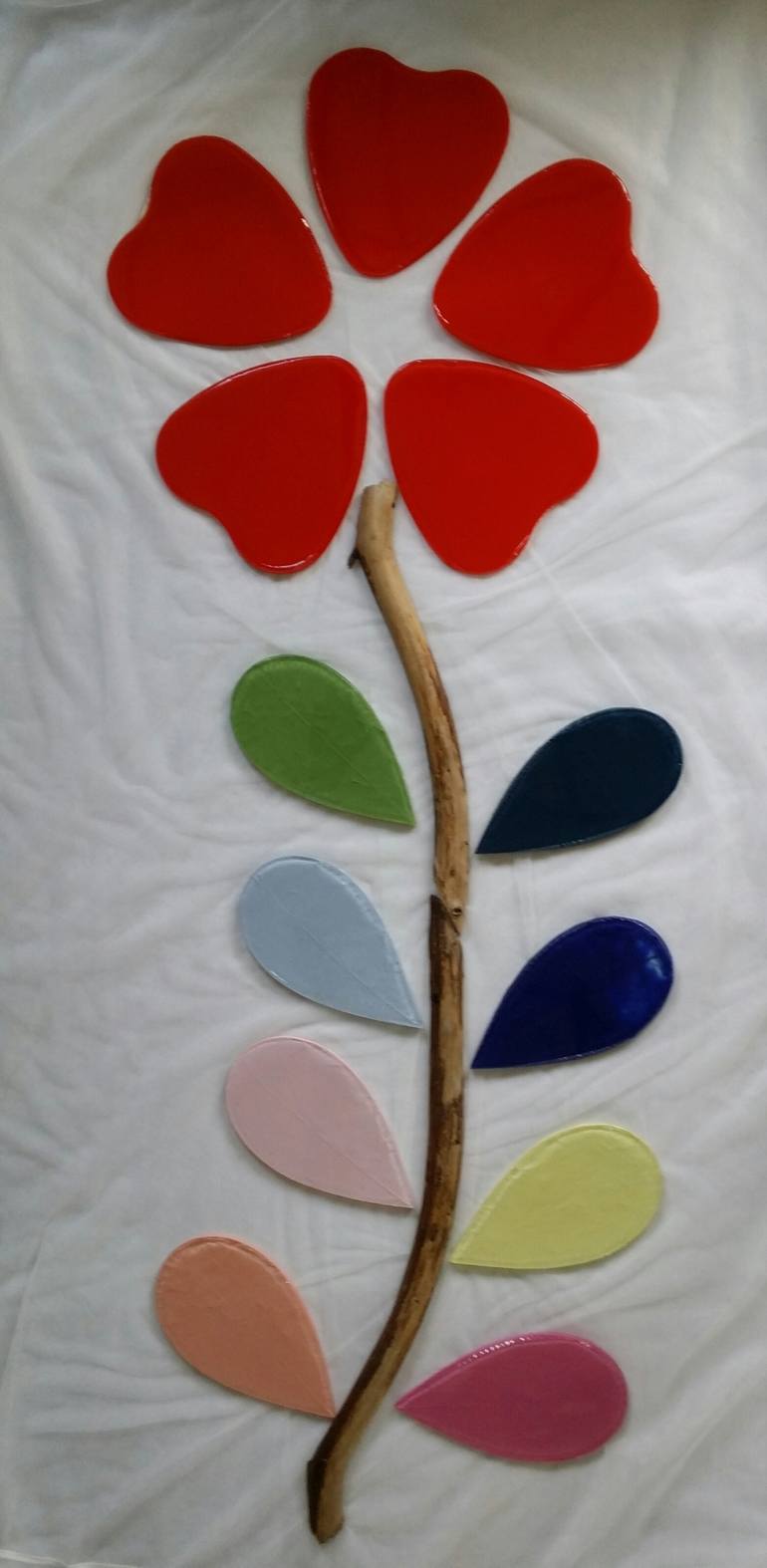 Red flower made of massive epoxy resin and real wood. Transparent resin mixed with special pigments for epoxy.