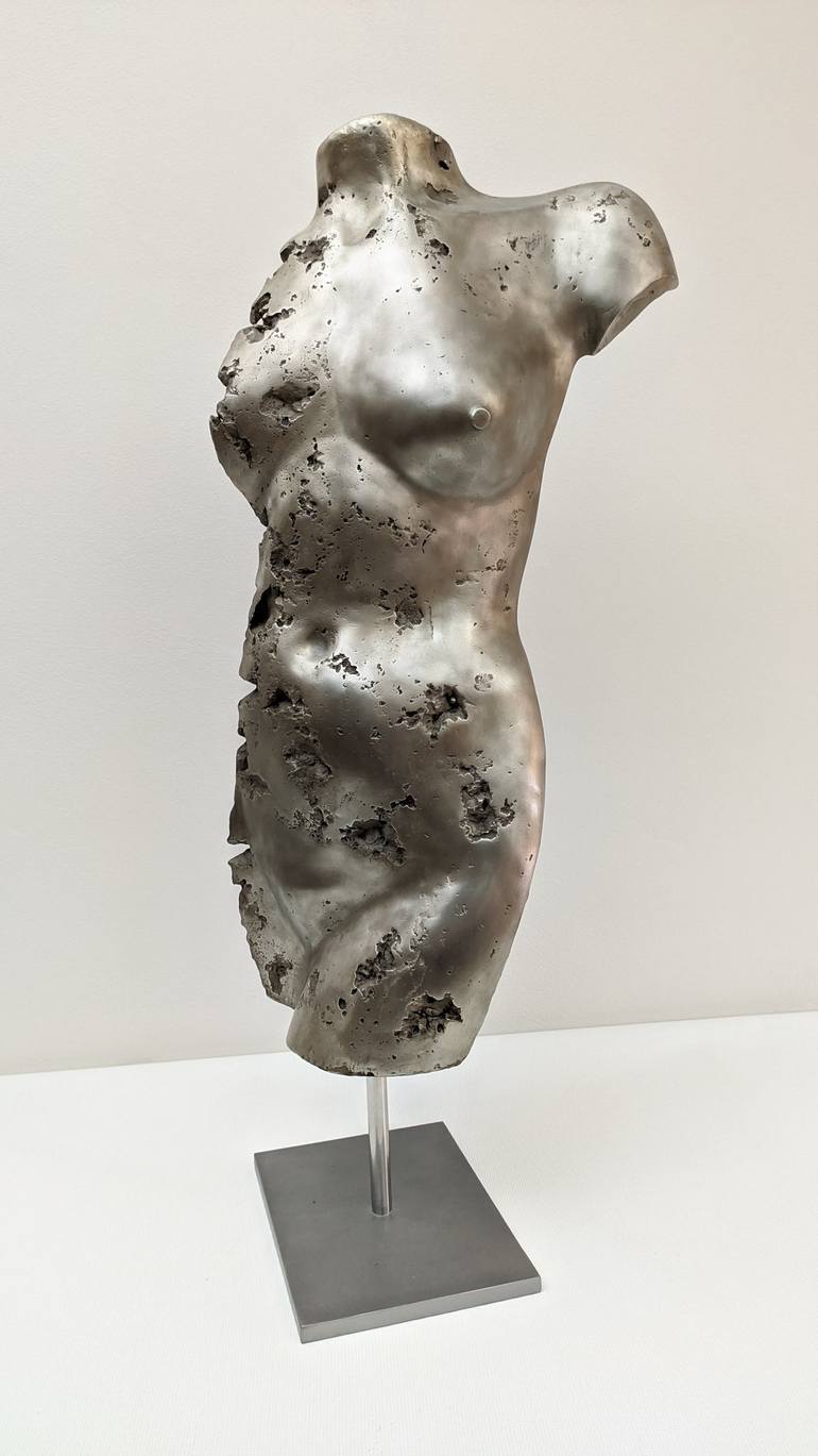 "Forged in Grace" is an abstract female torso sculpture crafted from metal, mounted on a sleek stainless steel stand with a complementary metal base. Its textured surface and flowing form evoke the raw beauty of the human figure, with every detail carrying an emotional resonance. The stand offers a...