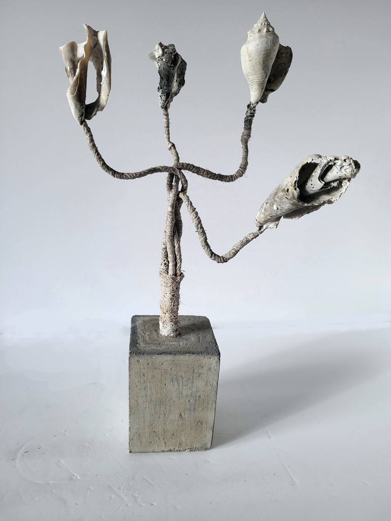 THESE WORKS ARE MADE FROM SHELLS FOUND ON THE BEACH, METAL WIRE, TWINE AND CEMENT. I WANTED TO MAKE THEM LOOK LIKE FOSSILIZED ANCIENT FLOWERS, OR LIKE FANTASTIC FLOWERS FOUND BY ASTRONAUTS ON OTHER PLANET.