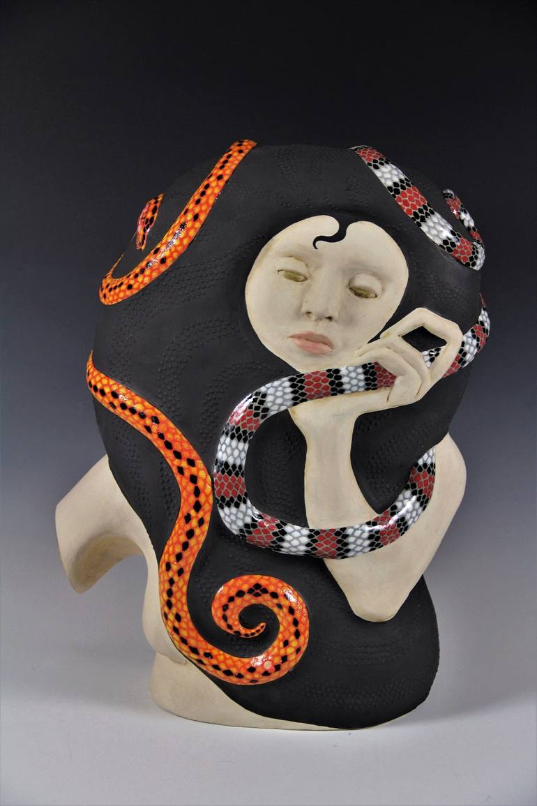 This work was inspired by Gustav's Klimt "The Beethoven Frieze" (1902). There are three Gargons depicted there and my sculpture is one of them. I slab build the sculpture, painted with ceramic underglazes colors, glazed the snakes and fired in electric kiln. It is signed on the bottom with my maiden...