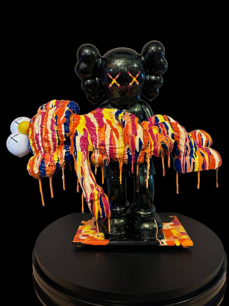 Genedieve, Vortex Fallen Species was inspired by the amazing work from Josh Mayhem and Kaws characters. This is a Vinyl sculpture made with metal wire, acrylic paint, clay, and adhesive. Clear resin was applied protecting the artwork. The Sculpture stands on a metal plate. Sign dated by Genedieve ...