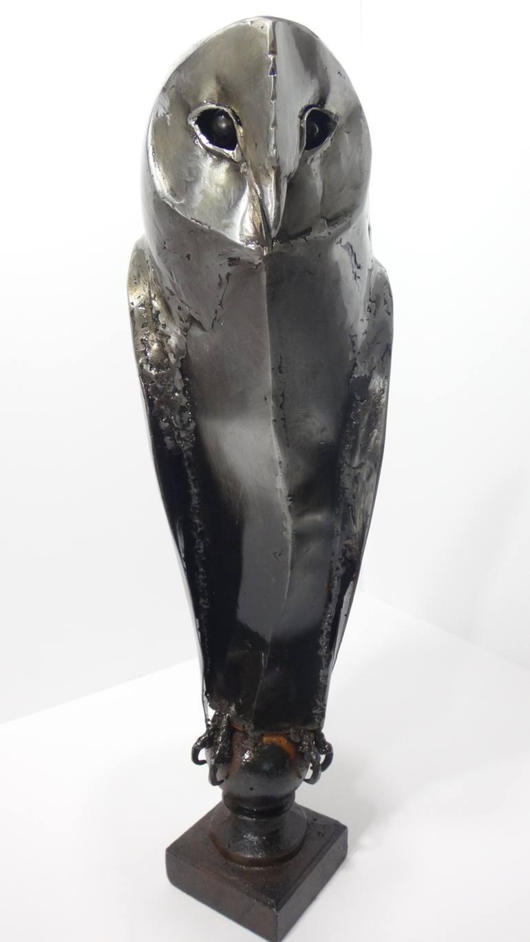 Any interaction with a barn owl is always a memorable event! The unique features of this species of raptor are both alien and spectacular. This sculpture begins with the unique light tone of the animal on its head and fades into an inky dark black patina near its talons. I loved playing with the sle...
